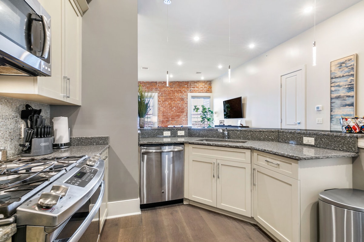 ⭑ Welcome to The Pontchartrain⭑ This stylish two-bedroom, two-bathroom suite features exposed brick, original wooden beams, and a spacious private outdoor area—blending New Orleans charm with upscale comfort. Perfect for couples, friends, or small groups, The Pontchartrain includes a fully equipped kitchen, indoor dining for six, and a bright living area in the heart of the Warehouse District. Just steps from the French Quarter, it’s your perfect base to explore the city.