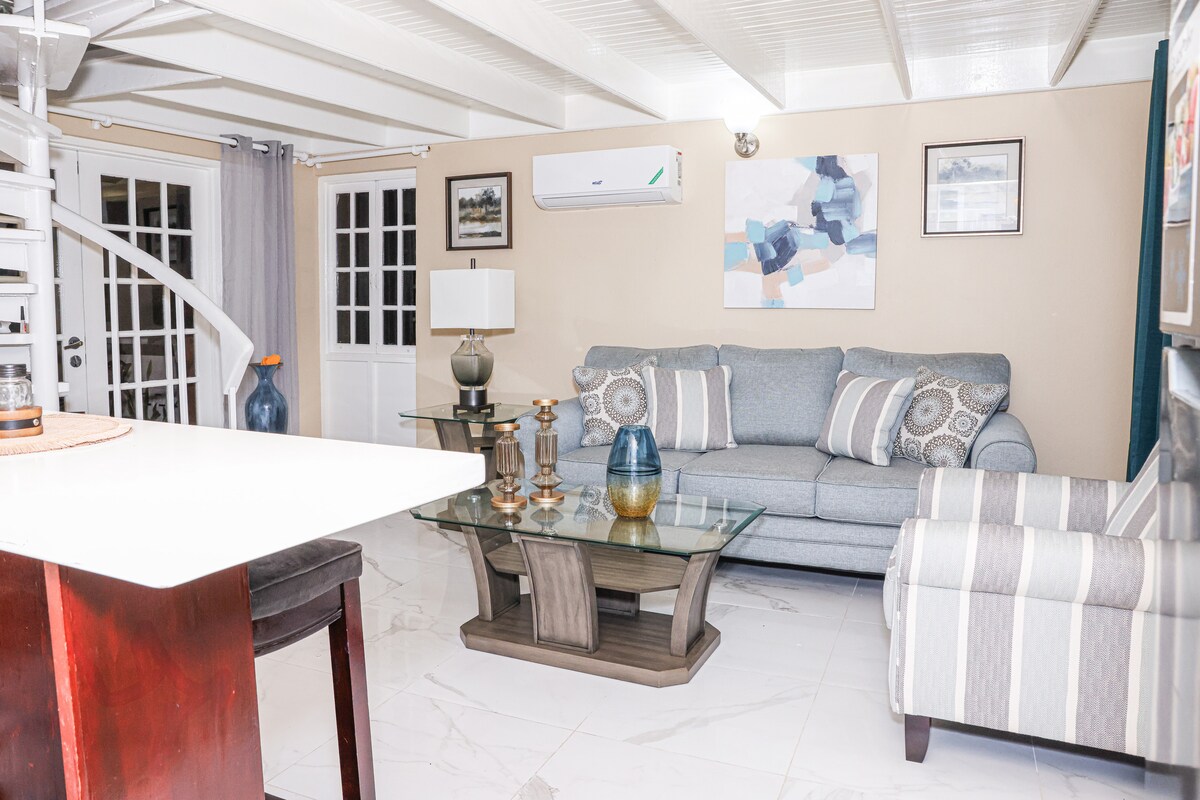 1 hálószobás apartman, queen méretű ággyal és futonnal egy további személy számára, kilátással a medencére, lélegzetelállító kilátással az óceánra, valamint Ocho Rios strandjára és városára, közel az összes népszerű látnivalóhoz. A dekoráció lágy kék színekben pompázik, amit jamaikai cédrusfa bútorok egészítenek ki, autentikus karibi hangulatot teremtve. Teljesen felszerelt konyha és saját veranda szabadtéri étkezéshez. A légkondicionáló, a meleg víz, az okostévé és az internet ideálissá teszi a távmunkához vagy egy nagyon szükséges pihentető nyaraláshoz.