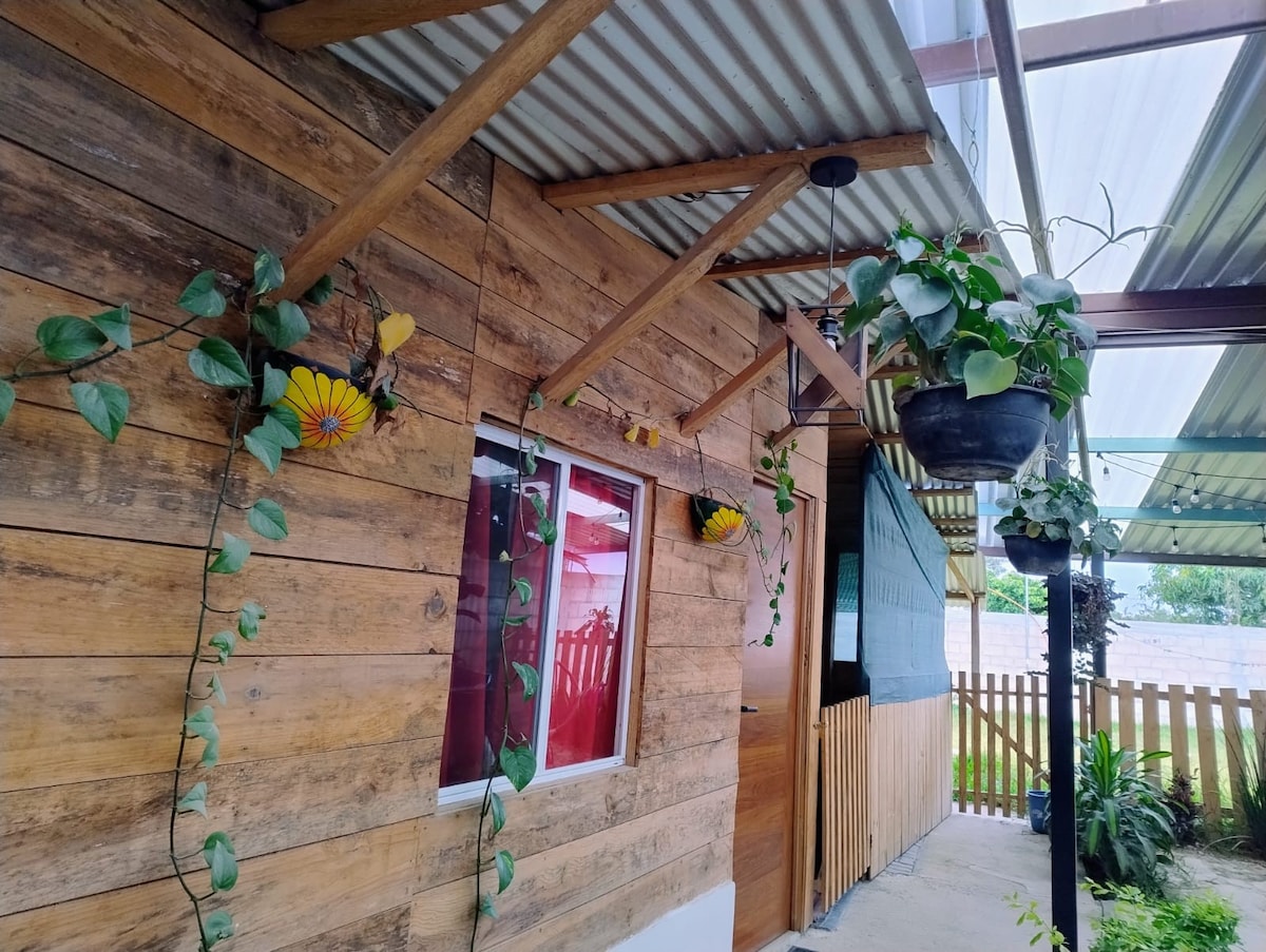 Cabaña para 3 personas con amplio jardín, estacionamiento para un coche con portón eléctrico, baño y medio, asador, cocina, área de lavado, wifi, tv, ubicado en espacio tranquilo y cerca de plaza comercial Las Flores