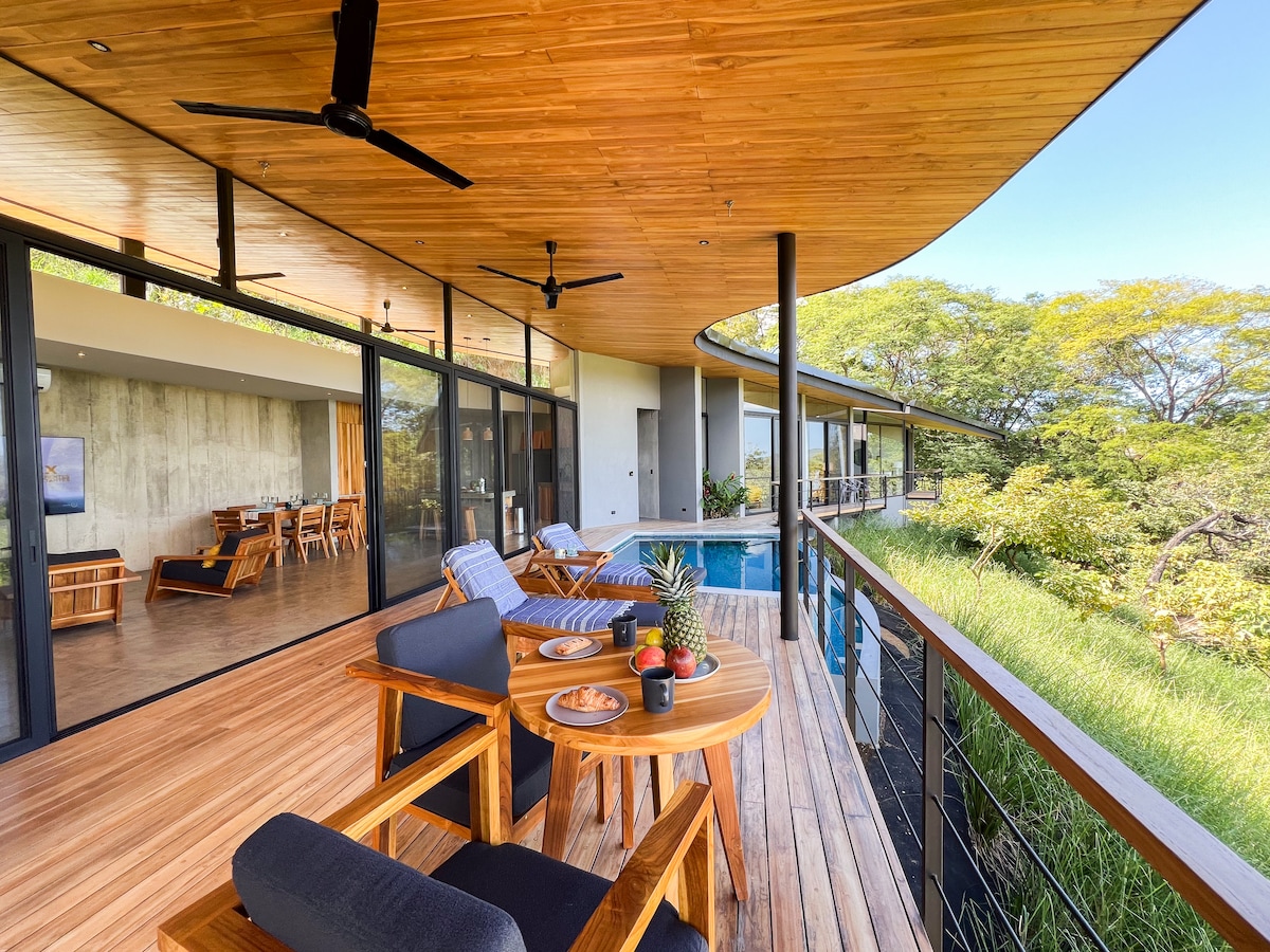 Beautiful 3 bedroom guest house within a gated development of Hacienda Pinilla and located in the exclusive beachfront private community of Avellanas,just steps from Avellanas beach.Quiet,calm and only 15 minutes from Tamarindo beach town. Plumeria Guest house is a two level,three bedroom home with full A/C uniquely designed to feel submerged in nature while being only 60 feet from the beach and close distance to surf breaks, Lola’s and Beachclub
