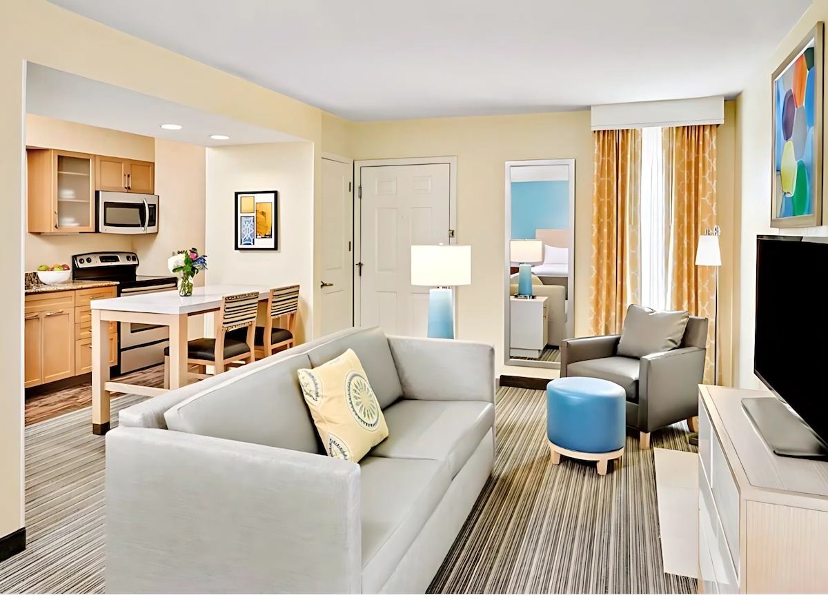 Tágas, 2 hálószobás sorház Tágas, 2 hálószobás sorház king méretű ággyal, két teljes ággyal és két fürdőszobával. Hangulatos nappali kandallóval, teljesen felszerelt konyha (tűzhely, sütő, mikrohullámú sütő, hűtőszekrény, mosogatógép), étkező és síkképernyős tévé kábellel. Élvezd az ingyenes Wi-Fi-t, a légkondicionálást, a hipoallergén ágyneműt és az ingyenes piperecikkeket. Tökéletes a hosszabb foglalásokhoz, az otthon minden kényelmével, beleértve a tea-/kávéfőzőt és az íróasztalt is.