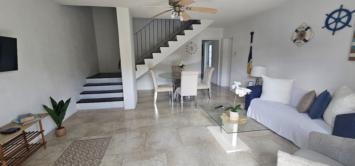 Ez egy tágas és modern, 2 hálószobás, 3 ágyas, 2,5 fürdőszobás sorház St. Philipben. Csak egy rövid autóútra a repülőtértől, a Six Roads bevásárlóterülettől, ahol élelmiszereket és éttermeket találsz, valamint a gyönyörű strandoktól és a híres Oistinstől. Minden hálószobában van légkondicionáló és saját terasz, valamint egy harmadik terasz a konyhán kívül a szabadtéri pihenéshez. A jellemzők közé tartozik a teljesen felszerelt konyha, a kulcs nélküli belépés, a nyitott elrendezésű nappali/étkező, a mosógép, a Wi-Fi és az ingyenes parkolás. Ideális párok, családok vagy üzleti utazók számára.