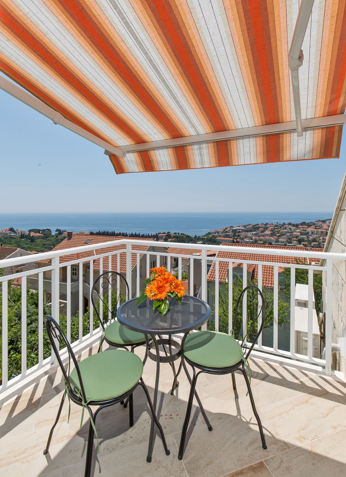 Ez a bájos szoba bútorozott erkéllyel kerül a padláson a családi ház, amely 5 szobából áll. Van egy franciaágy két fő részére, és egy kanapé-ágy. A szoba légkondicionált, TV-vel, hűtőszekrénnyel, vízforralóval és ingyenes Wi-Fi-vel felszerelt. Saját, jól felszerelt fürdőszobája van a folyosón (törülközők, tusfürdő, sampon biztosított). Privát erkélyéről Dubrovnik és a tenger lélegzetelállító panorámáját élvezheted.