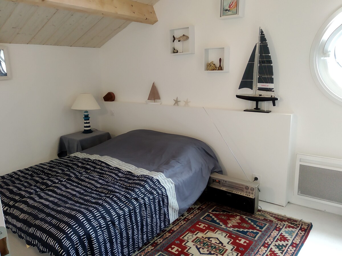 A ház nagyon csendes helyen található, vidéken, strandokon, erdőben és mocsarakban, kerékpárral 10 perc alatt. Centre Ville des Sables d 'OOonne 10 perc autóval. Élvezheted a 14 m2-es hálószobát, a 12 m2-es nappalit, amely kanapéval és TV-vel van felszerelve. Élvezni fogod a privát zuhanyzószobát és a vécét. Reggel napsütésben lesz részed, felhúzhatod a függönyöket, és széles körben elérhető lesz a napsütés az Olonnes földjén.