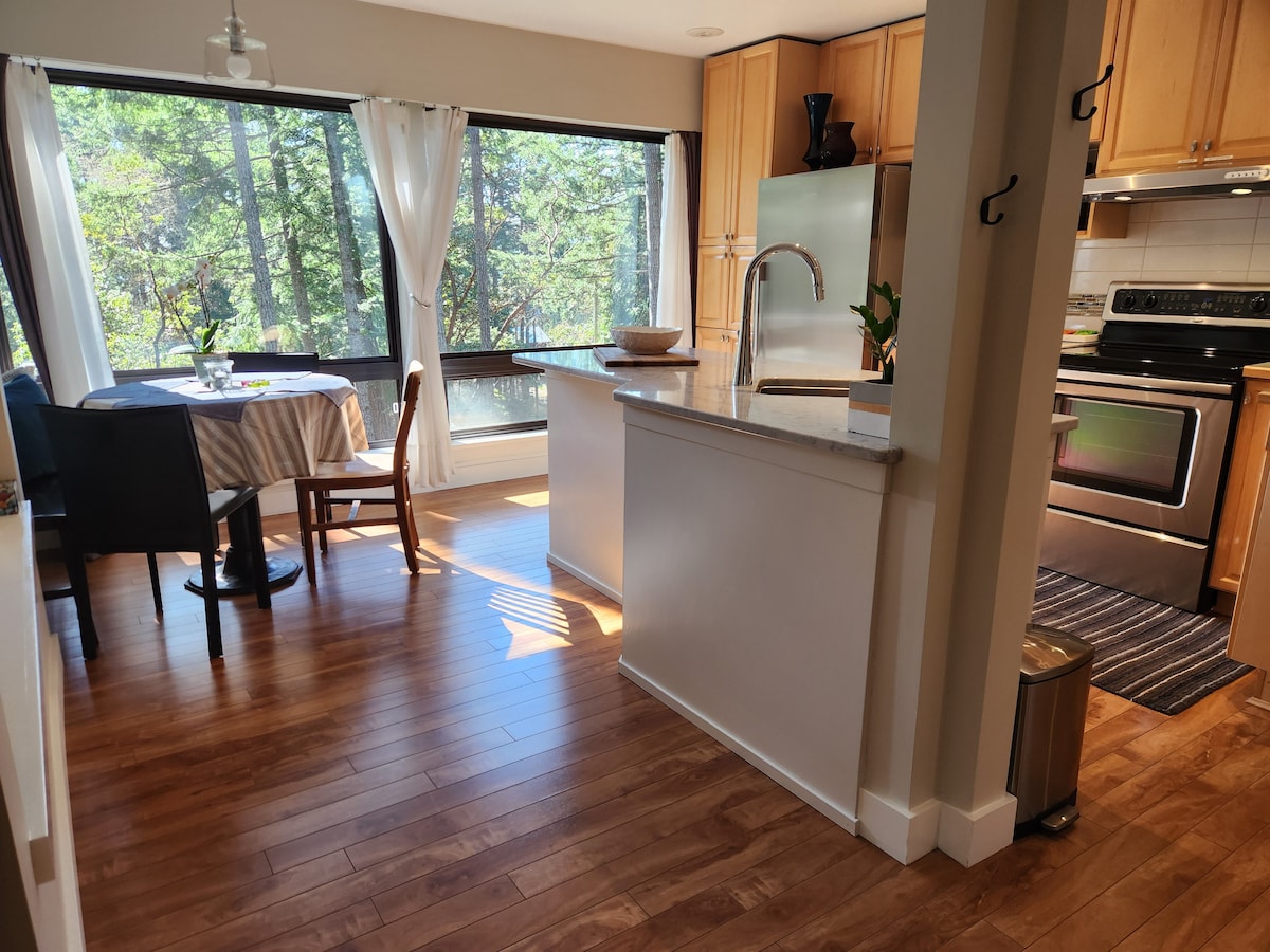 A Triangle-hegy tetején, egy 2 hektáros fennsíkon üldögélve egy kertben, egy erdő csendjében található kisétáló lakosztályunk a helyi üzletek, strandok, a Hatley-kastély, a Thetis-tó és egy 30 perces autóút Victoria belvárosa felett található. Ideális azok számára, akik elvonulásra vágynak, vagy központi elhelyezkedésre van szükségük Victoria nagyobb részén. Tökéletes a nyugati part vagy a város felfedezéséhez! Kényelmes queen méretű ágy és egy queen méretű (amerikai alvó) kanapéágy. Élvezd az ingyenes Nespresso kávét, a wifit, a Smart-TV-t, az elégtelen mosást és a grillt.