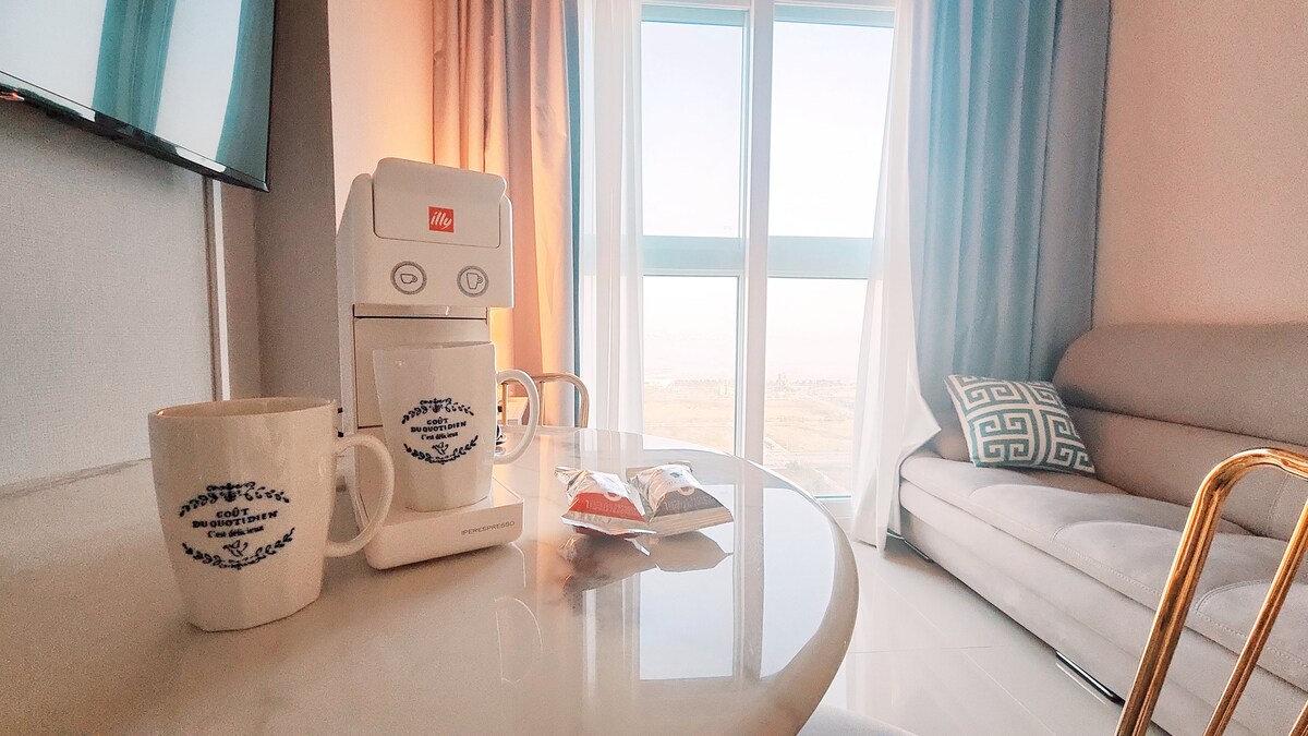 🏠Ez egy luxuslakás, ahol pihenhetsz, miközben élvezed az óceánra nyíló kilátást, és zenét hallgatsz, ha egy minibárt telepítesz az erkélyedre. Támogatja az értékes napodat azzal, hogy hangulatos és kellemes légkört biztosít egy rövid szünetre a zsúfolt városközpontban. 💘INGYENES NETFLIX, erkély, bár, ingyenes parkolás