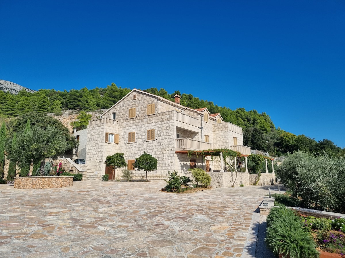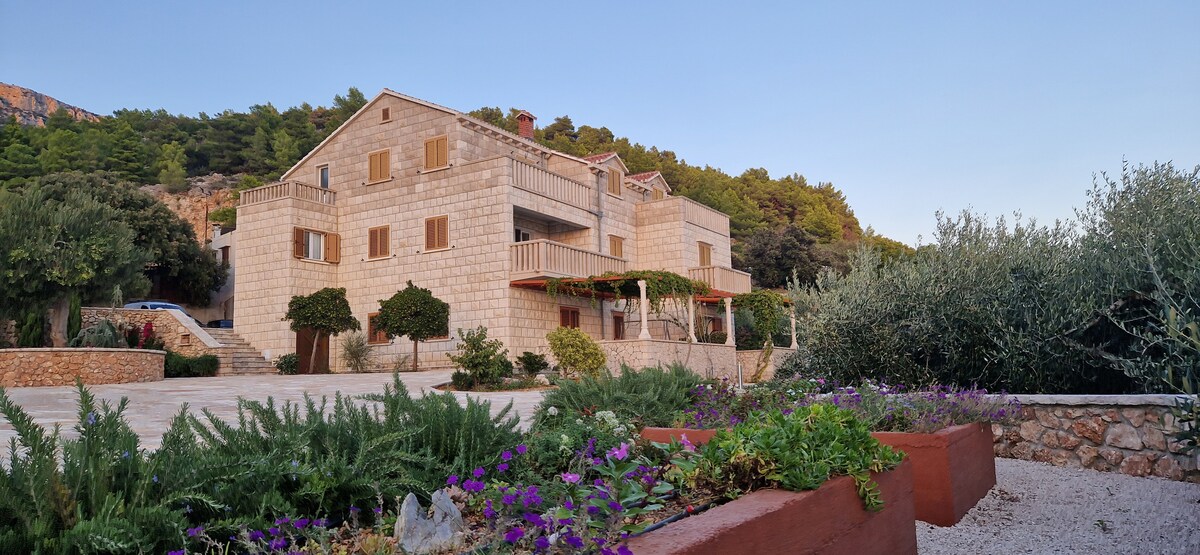 A tágas (120 m2) teljesen felújított 3 hálószobás apartman 3 fürdőszobával, relaxációs zónával és csodálatos kilátással a tengerre, kilátással a boli kikötőre és a nyílt tengerre. Található kellős közepén Bol csendes lakónegyedében. Az apartman egy teljesen funkcionális CSALÁDI OTTHON, teljesen felszerelt konyha, minden készülékek és eszközök. Minden szoba külön-külön légkondicionált, és a hálószoba külön van választva a nappali és az étkező.