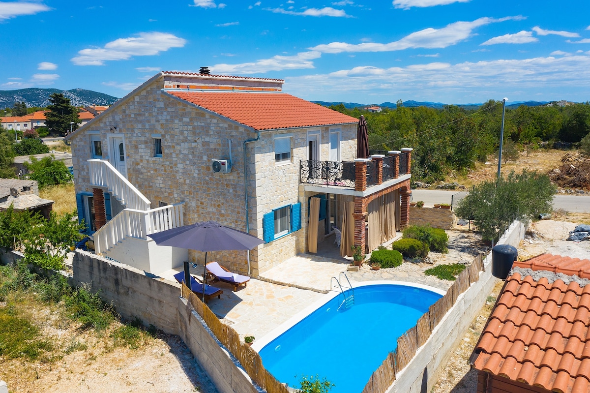 Ez egy újjáépített hagyományos dalmát kőház. Tartalmaz egy közös kertet kőgrillel. Az első emeleten található lakás 32 négyzetméteres belső területtel és légkondicionálóval rendelkezik a fűtéshez és hűtéshez. Egy hálószoba franciaággyal. A kétszemélyes kanapé/ágy a nappaliban található teakonyhával. A fürdőszobában zuhanykabin és meleg/hideg víz található. 4 vendég fogadására alkalmas. A tengerpart 300 méterre található a háztól, mindössze 5-10 perc sétára.