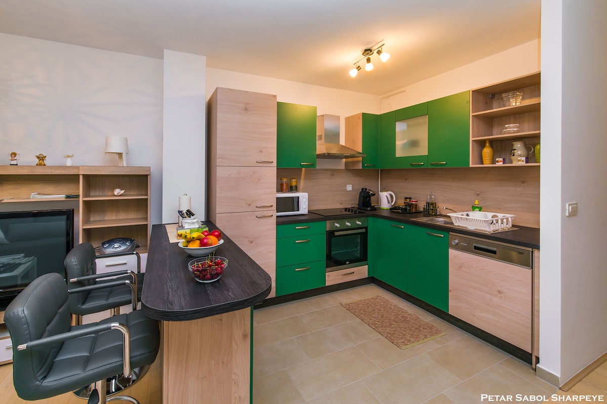 Luxus, teljesen felszerelt, 100-as számú (74 m2) privát apartman csendes kényelmet és modern felszereltséget kínál egy felejthetetlen tartózkodáshoz - saját konyha (mikrohullámú sütővel, hűtőszekrénnyel fagyasztóval, indukciós főzőlappal, kávéfőzővel, vízforralóval, mosogatógéppel felszerelt), saját fürdőszoba, hálószoba HD TV-vel - műholdas és Netflix csatornával, nappali UHD TV-vel és műholdas programokkal + Netflix csatornával, ingyenes wi-fi, önálló be- és kijelentkezés és nagy közös zöld kert.