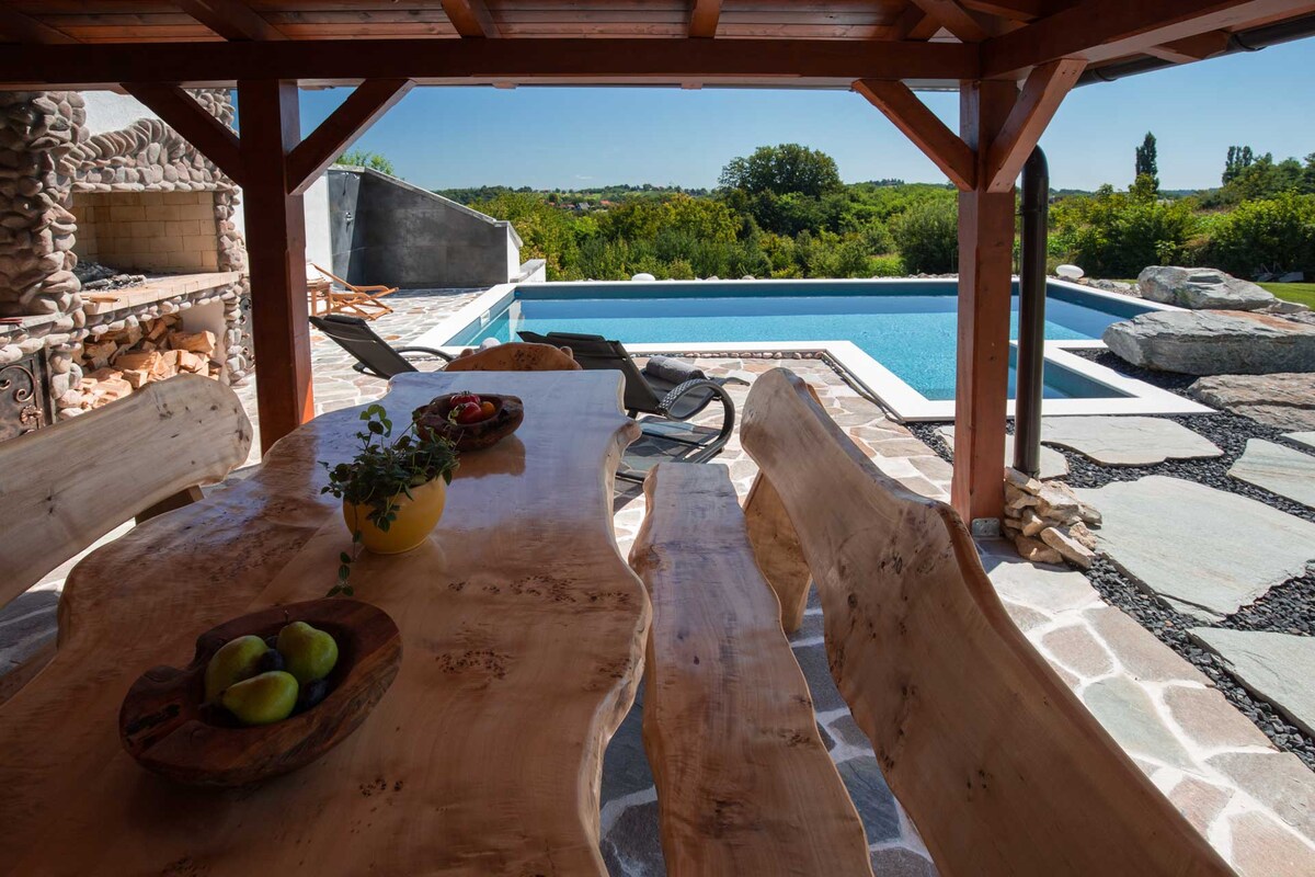 Kézzel készített villa fűtött szabadtéri medencével, gyógyfürdővel