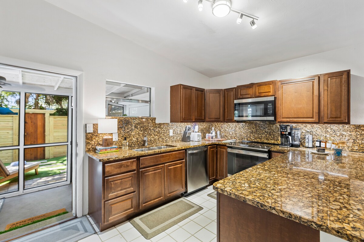 Gyönyörű, újonnan felújított otthon központi elhelyezkedésű. 3 hálószoba (2 King 1 Queen) és 2 teljes fürdőszoba (1 séta a zuhanyzóban kapaszkodókkal). Kocsibeálló. Hatalmas és privát udvar, ahol élvezheted! Kényelmes nappali nagyképernyős TV-vel, kanapékkal és lusta fekvőfotelekkel. A konyha teljesen felszerelt a főzéshez. Irodai íróasztal és szék. Mosógép és szárítógép. 10 perc a Universal Studiosig, és csak néhány perc alatt elérhető az International Drive, a Mall of Millenia, a Florida Mall vagy a Disney. Élelmiszerbolt, likőr, pizza, kínai 5 perces sétával.