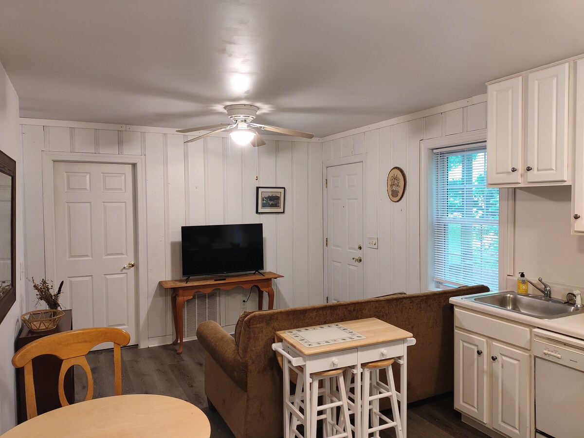 Egy út végén található ez a MIL lakosztály, amely a házamhoz csatlakozik, és egy parkhoz hasonló, 3 hektáros területen helyezkedik el. Elülső és hátsó bejárattal, elkerített hátsó udvarral, piknikasztallal, teljesen felszerelt konyhával és dolgozószobával rendelkezik. Az egyik hálószobában franciaágy található. A másik hálószobában egy egyszemélyes ágy. Egy teljes fürdőszoba szép, új, 6 láb hosszú káddal/zuhanyzóval. Ez a hely egyszerű, tiszta és készen áll a vendégek fogadására. A hely saját központi fűtéssel, légkondicionálóval és vízmelegítővel rendelkezik. Nyugodtan pihenek, ha tudom, hogy ez a foglalás olcsóbb, mint egy helyi motel.