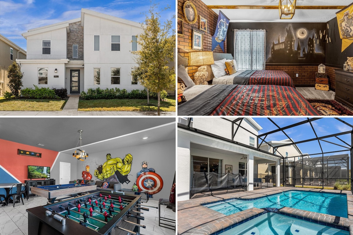 Epic 10-bedroom themed luxury villa near Disney — sleeps 22 — with private pool & hot tub, movie theater with reclining seats, and a Marvel/LEGO arcade featuring racing simulators, air hockey, foosball & pinball. Includes elegant king suites and magical kids’ rooms (Toy Story, Star Wars, Minions, Beauty & the Beast). Perfect for multi-family getaways — just 20 minutes from Magic Kingdom.