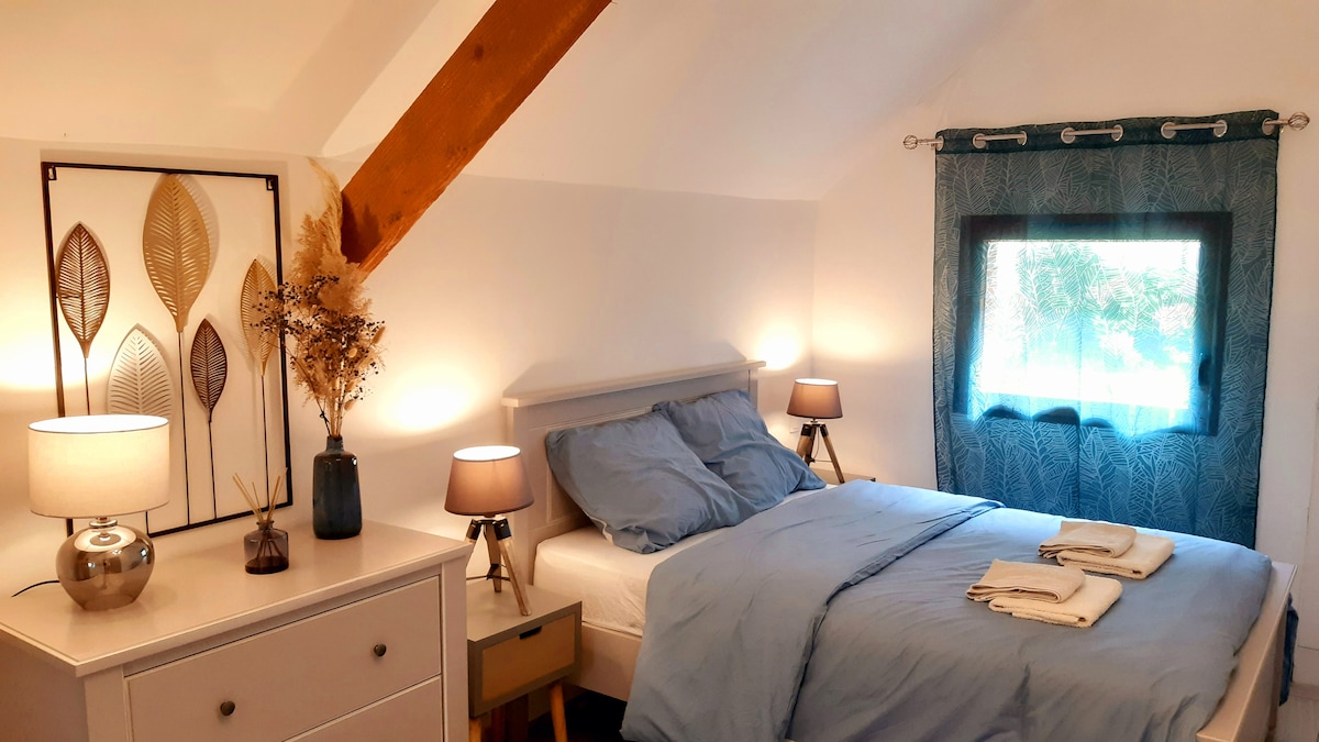 Pihenj ebben a csendes és elegáns szálláshelyben. Hangulatos ház egy 40 m2-es duplexben, csendes, és nem hagyják figyelmen kívül az életet. Orleans center, Parc Floral et bord du Loiret, Archette hospital and clinic , university and ERTs, artisanal area of the Alnaies, walks and golf, zenith and CO 'met. A plus loing the Chateaux Chambord, Cheverny and ferté st aubin, the zoo de beauval, on the wine route and at the Porte de la Sologne. Önálló bejutás és távozás zárt tér, ahol elfér egy ló