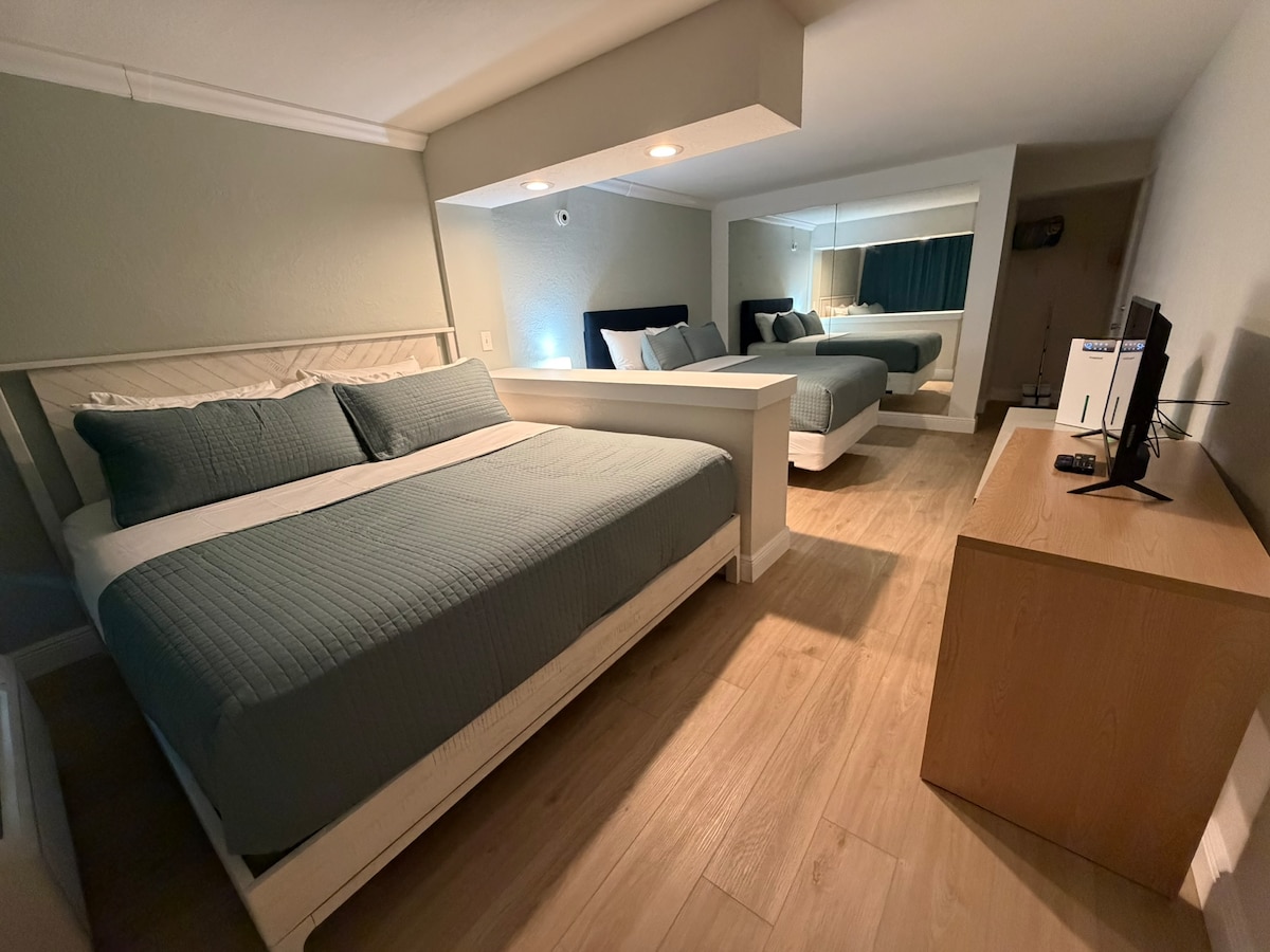 Enjoy a relaxing stay in the Horizon Suite at Atlantic Shores, featuring a full kitchen and space for the whole family, including doggies 🐶, just literal steps from Daytona Beach 🌊. This bright, spacious suite includes a king bed, twin daybed, and queen sofa bed, sleeping up to 5 guests. Cook your fav meals in the fully equipped kitchen with coffee maker, waffle maker, toaster, cookware. Parking, Wifi, TV streaming included