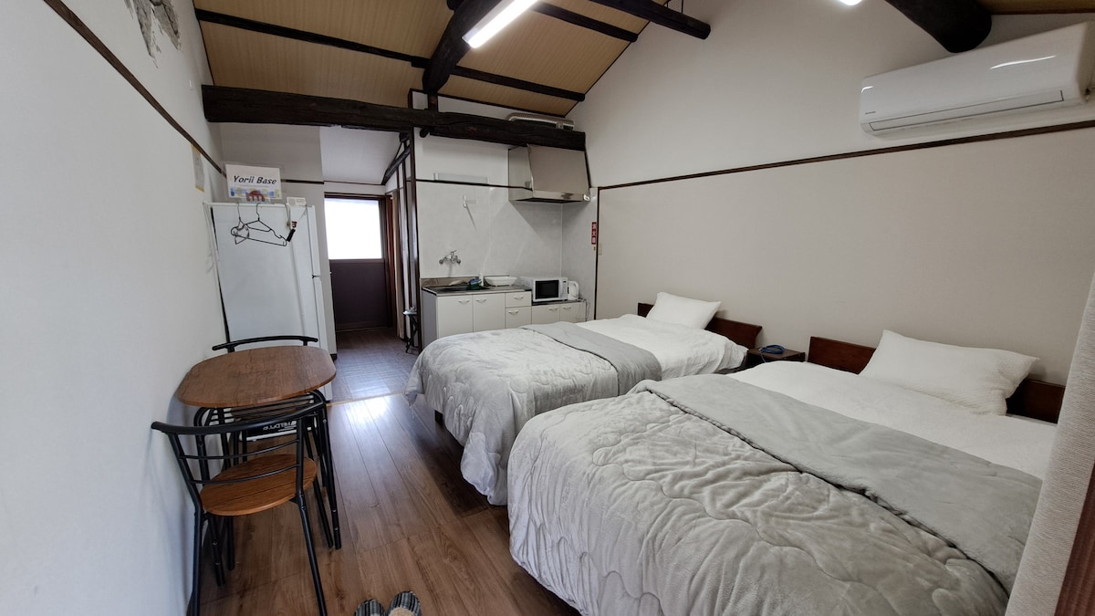 秩父エリアへの玄関口、寄居駅から徒歩1分の小さな宿です。古い長屋の一部を残して作られた建物は、一軒家のような外見です。室内は、床や壁が奇麗に改装されていて、天井が高く、太い黒い梁が見えます。 宿から歩いて5分程の場所には、24時までオープンしている大きなスーパーマーケットの他、ドラッグストア、100円ショップ、コインランドリーがあります。スーパーマーケットからさらに1分ほど歩けば、24時間営業しているコンビニエンスストアもあります。 秩父や長瀞、埼玉県北西部への旅行や登山での宿泊。熊谷、深谷、本庄など、寄居町周辺地域でのビジネスでの宿泊。その他、少人数での気軽な宿泊に是非ご活用ください!