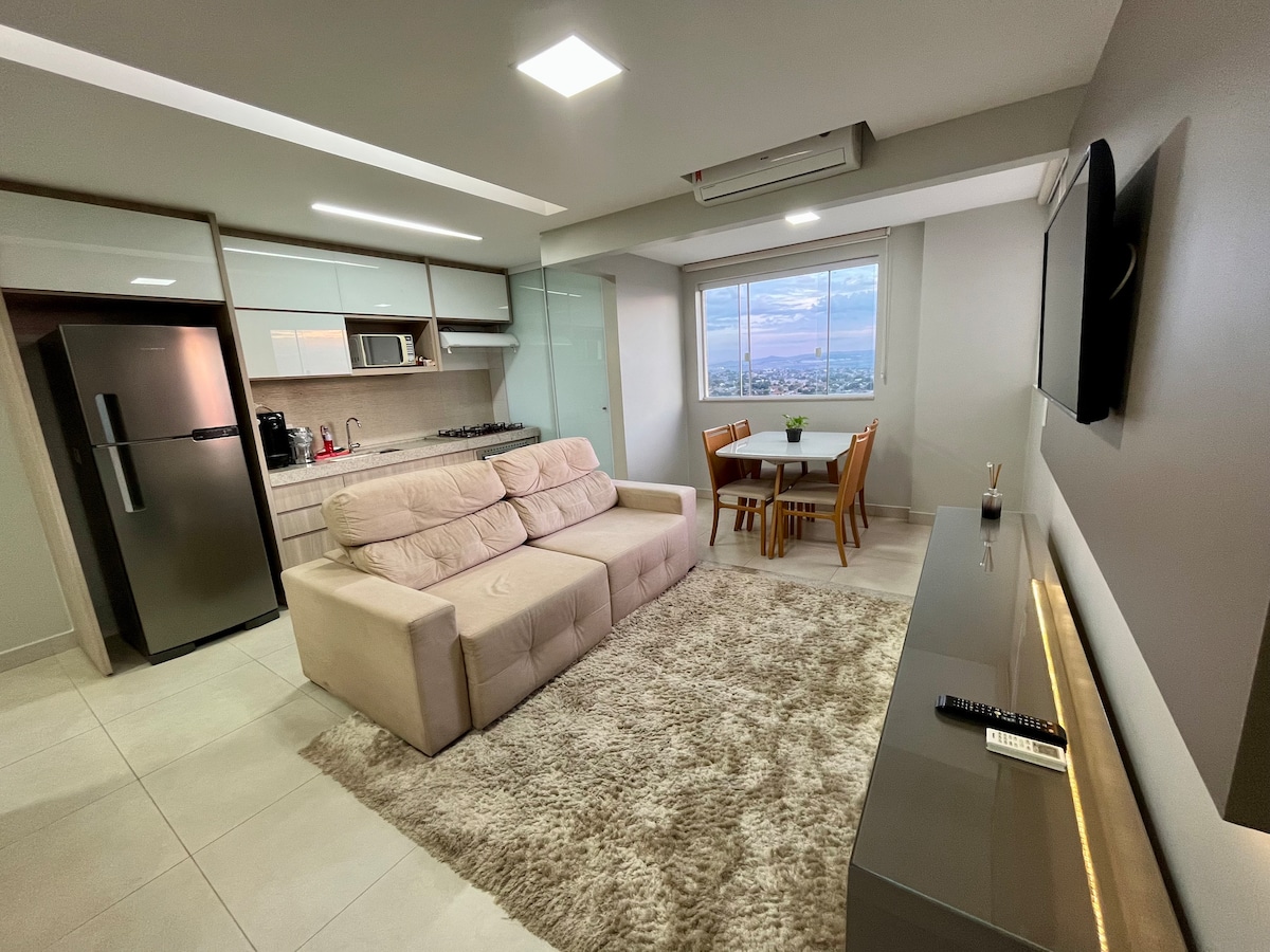 Apartamento alto padrão ao lado do shopping Flamboyant, região fácil acesso, ótima vista, com toda comodidade do maior shopping da cidade. Com dois quartos, sendo uma suíte, varanda gourmet com mesa bistô, sala jantar e estar com mesa e quatro cadeiras, ar condicionado nos quartos e na sala, Internet, duas TVs, uma cama queen, duas de solteiro, entregue com roupas de cama e banho, lava e seca, utensílios de cozinha e outras comodidades. Garagem coberta, portaria 24h .