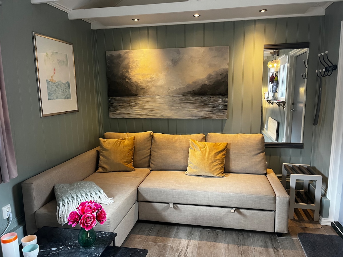 Ez egy újonnan felújított és szellős miniház franciaággyal, konyhával és étkezővel, gardróbbal, fürdőszobával és alvóotthonnal. A helyszínen ingyenes privát parkolás biztosított. Központi elhelyezkedés üzleti és nyilvános kommunikációval a közelben. Rövid út a fjordhoz stranddal, étkezővel és túraútvonalakkal. Jó hely a nagygyermekes családoknak /legfeljebb négy fős társaságnak is, amelyek közül kettő elég mozgékony az alvóházig vezető lépcsőkhöz. Privát terasz és buja kert a nyári hónapokban.