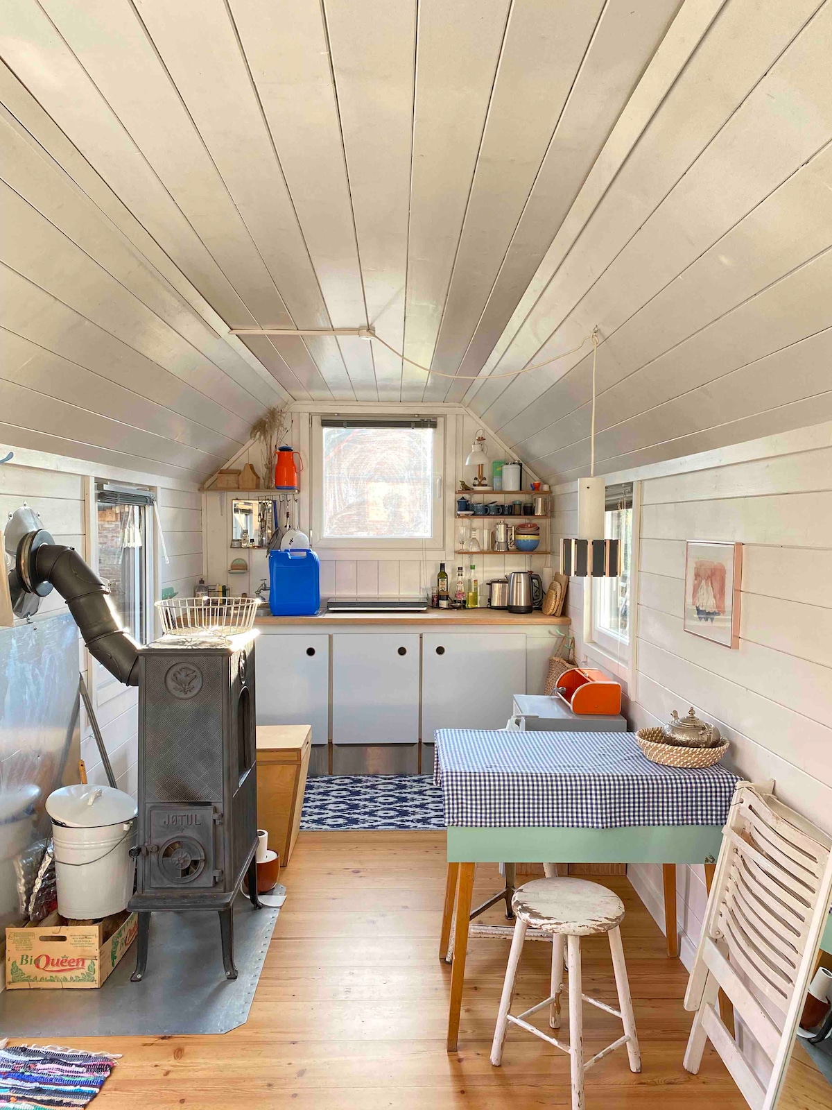 Az építőipari lakókocsi egy 100 éves pajtával szemben található, amelyet stúdióvá alakítottam át. Az építőipari lakókocsi 17 m² -es, konyha-nappali, kétszemélyes ággyal egy szobában. A konyha indukciós tűzhellyel, vízforralóval, kis hűtőszekrénnyel és mosogatóval (víztartály) van felszerelve. Mindent megtalálsz, amire szükséged lehet a konyhai eszközök, az edények és a fűszerek tekintetében. A fatüzelésű kályha szükség esetén gyorsan meghitt meleget teremt. Vendégek - a zuhanyzó és a vécé a pajtában található.