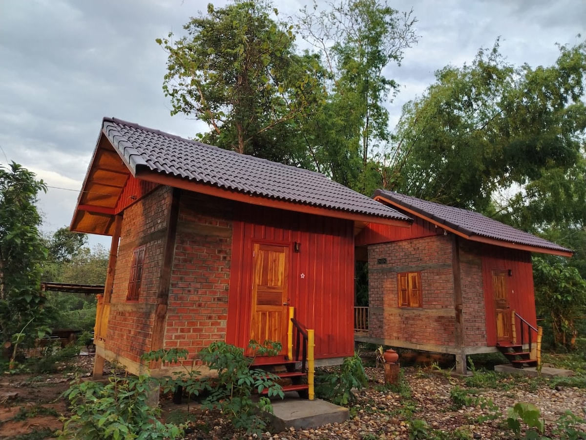 Hagyományos faház a dombon, lélegzetelállító kilátással a hegyre. 14 m2-es faházak king méretű ággyal vagy kétszemélyes ággyal. Pihentető szoba rusztikus helyi bútorokkal és gyönyörűen berendezett, laoszi helyiekkel együttműködve. 13m2-es erkély panorámás kilátással a hegyekre. A szobák felszereltsége: ventilátor, szúnyogháló, ivóvíz, ruhatartó állvány, alacsony asztal, karosszékek. KÖZÖS fürdőszobai tömb zuhanyzóval, forró vízzel, tusfürdővel, samponnal, hajszárítóval, törülközővel és vécépapírral.
