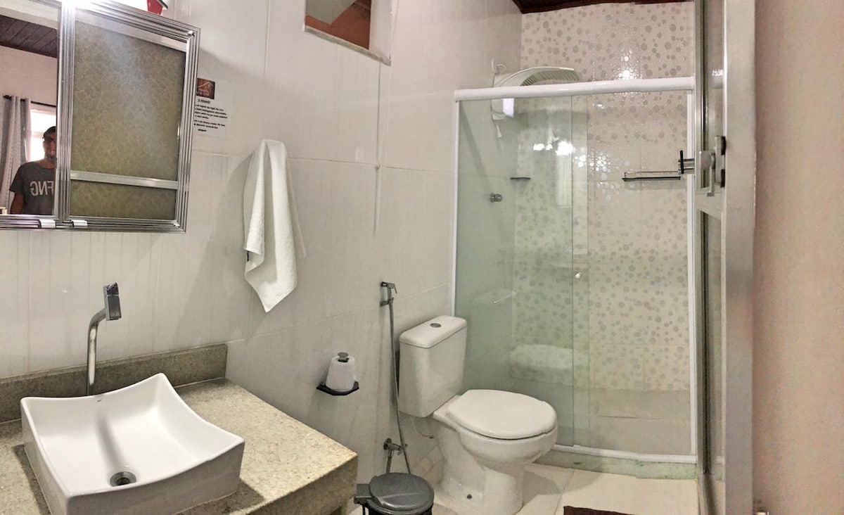 Prepare-se para uma estadia inesquecível! Nossa suíte privativa oferece o conforto e a localização perfeita para sua aventura em Arraial do Cabo. ✨ O Que Você Vai Encontrar: - Aconchego Garantido: Quarto com cama de casal e banheiro privativo. - Entretenimento: TV com acesso a Netflix para relaxar após um dia de praia. - Conectividade: Wi-Fi rápido para planejar seus passeios ou trabalhar. - Comodidade: Frigobar para suas bebidas e lanches. - Cozinha Compartilhada
