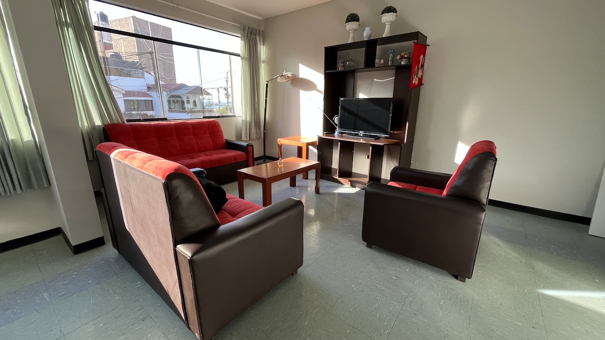 Tágas és kényelmes, három hálószobás lakás Residencial Pacocha, Ilo. A Boca del Río strand, a Parque del Minero és különböző üzletek közelében. Felszerelt konyhával, tévével felszerelt nappalival és kényelmes szobákkal rendelkezik a pihenéshez. Élvezd a csendes szállást egy lakóövezetben, ahonnan könnyen elérheted a város látnivalóit és szolgáltatásait. - Kérjük, vedd figyelembe: az 5. emeleten van, lift nélkül. A parkolás szabadtéri, kijelölt helyen történik, közvetlen hozzáféréssel az utcáról.
