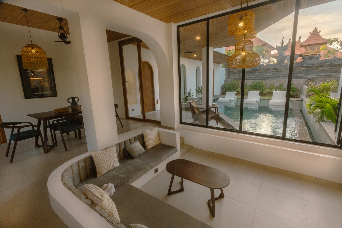 Brand New Designer Villa in Peaceful South Bali • 1 stylish air-conditioned bedroom with en-suite bathroom • Large swimming pool surrounded by tropical greenery • Bright open-plan living room & fully equipped modern kitchen • 300 Mbps Wi-Fi for work & streaming • Netflix & PS5 on request • Large outdoor terrace perfect for BBQs & lounging • Daily cleaning with fresh towels & linens • Baby cot & high chair on request • Concierge service for airport transfers, scooter rentals, spa bookings & more