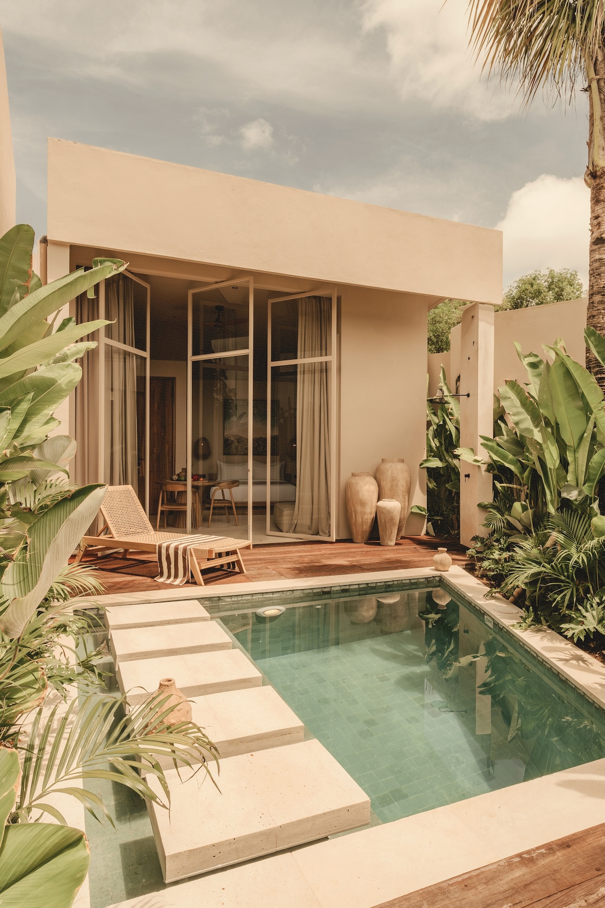 Nestled magically atop the cliff of Impossible Beach, with a stunning 180 degrees view of the Indian ocean. This property is artistically designed with a tropical tree house concept that blends in an earth-inspired soft tone that creates an inviting and peaceful environment while taking in the natural elements of the jungle and the ocean. This honeymoon suite with a charming plunge pool and a hammock net set up on the private balcony for you to enjoy every small moment with your loved ones.