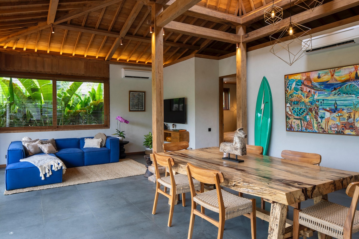 A charming villa with loft bedroom & complete amenities. Living room with TV, AC, free WIFI, fully equipped kitchen with necessary utensils, fridge, hot water, wooden patio, plunge pool facing a tranquil jungle in Padang-Padang area in Uluwatu. free parking space & surfboard rack. 5 minutes to Padang-Padang beach and 10 minutes to Uluwatu beach. Suitable for couple, digital nomad, slow traveler. IT'S AVAILABLE AT A LOWER PRICE SINCE THE EXTERIOR CONSTRUCTION IS STILL BEING COMPLETED.