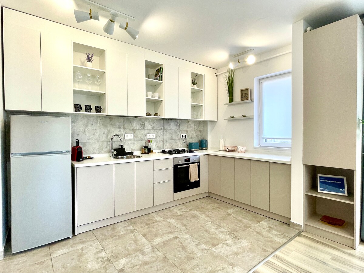 Ez a világos és otthonos, egy hálószobás lakás tökéletes egy pihentető tartózkodáshoz, akár üzleti, akár szabadidős célból látogatsz ide. Az erdő mellett található a friss levegő, a gyönyörű kilátás és a könnyű hozzáférés a természethez, miközben közel vagy a városhoz. Akár Temesvár felfedezésére, akár csak pihenésre jársz, ez a 9. emeleti lakás tökéletes egyensúlyt kínál a kényelem és a nyugalom között. Már nagyon várjuk, hogy vendégül láthassunk! Vezetési távolság: Temesvári repülőtér: 13 perc Szupermarketek: 3 perc Városközpont: 12 perc