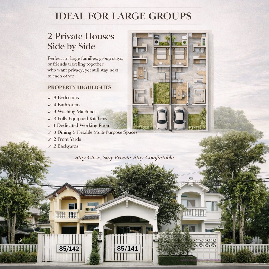 Üdvözlünk modern thai házunkban, egy átgondoltan megtervezett, egyszintes otthonban, amelynek megemelt alapjai a thai építészet eleganciáját ötvözik a letisztult, modern esztétikával. A tágas privát kertben pihenhetsz, lélegezhetsz, és kapcsolatba léphetsz a természettel, ami tökéletes a reggeli kávéhoz, az esti beszélgetésekhez vagy a barátokkal való meghitt összejövetelekhez. Ez az otthon a hagyományos thai élet melegét ötvözi a modern dizájn kényelmével és egyszerűségével, és minden foglaláshoz nyugalmat és rugalmasságot kínál.