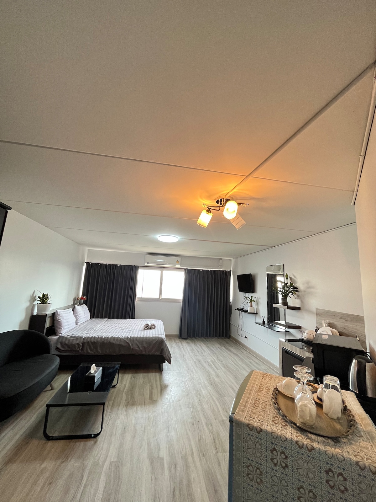 Perfect for solo stays or group trips. whether traveling alone, with family, or friends. The room features a large bed, and a fully equipped kitchen with cookware, dishes, and dining area. Enjoy high-speed Wi-Fi, air conditioning, Smart TV with YouTube and Netflix, washing machine, dryer, and plenty of storage. Located near shopping malls, BTS station, van terminal, and 24-hour supermarkets. Easy taxi access and surrounded by affordable local food. Just a short drive from Don Mueang Airport.