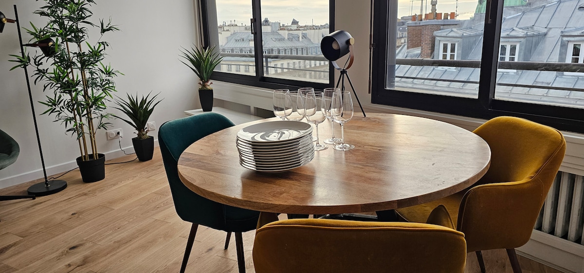 Unique Flat located at the limit of the 9th and 2nd by Boulevard Haussmann! The renovation of about 370sqf includes a fully equipped kitchen – living and dining space filled with light – the loft area offers a queen size bed under a large skylight. The flat has air conditioning to stay cool during warm days. Minutes 'walking to trendy restaurants, bars and fancy stores! 6 metro lines and buses minutes’ away! BATH RENOVATED 01/26!