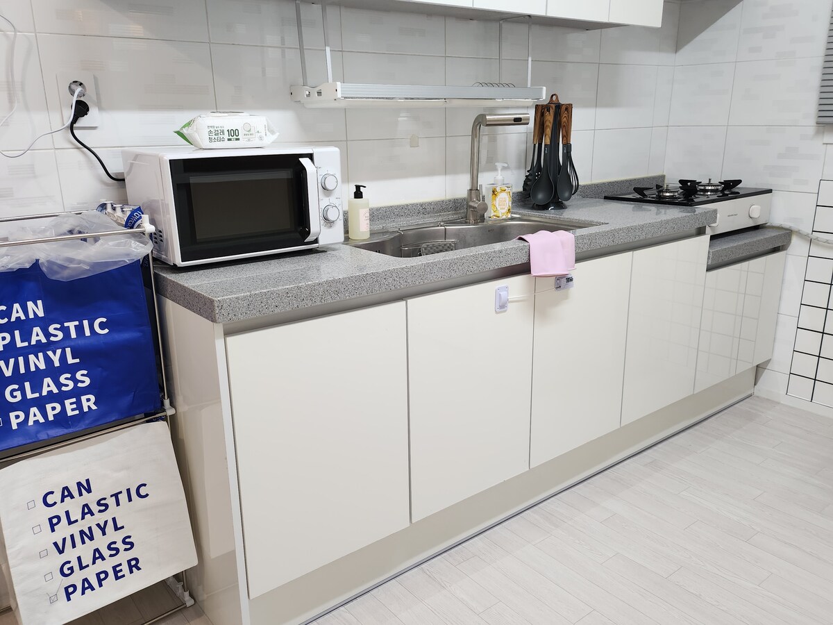 „Boldog időnk” A Daegu Innovation City csendes, és jó a levegő :) Mit szólnál ahhoz, hogy kényelmes szálláson gyógyulj? Kényelmesen parkolhatsz. 20 pyeong (6,65 négyzetméter), 2 szoba, egy tágas nappali és 1 fürdőszoba található benne. # Hálószobák # 1 queen méretű ágy a fő hálószobában (Simmons), 1 szuper egyszemélyes ágy (Ace) 1 queen méretű ágy (Ace) egy kis szobában Az ágyneműt mindennap kimossák a tisztaság fenntartása érdekében # konyha # Egyszerűbb főzés lehetséges, de olajos és zsíros ételek (hal, hús, pörkölt) készítése nem engedélyezett. Köszönjük a megértésedet a szálláshely tisztán tartásával kapcsolatban :) Hűtőszekrény, mikrohullámú sütő, elektromos vízforraló, fazék, serpenyő, főzőeszközök, kanál Tálak, poharak, 3 égős tűzhely, 4 személyes asztal # fürdőszoba # Ez egy modern és rendezett fürdőszoba Hanssem fürdőkáddal. Érdemes kicsit higiénikusabban használni Minden tőlünk telhetőt megteszünk, hogy tisztán tartsuk. Sampon, tusfürdő, kézmosó, fogkefe, fogkrém, törülköző, hajszárító # stb. # 55 hüvelykes okostévé Rendelkezésre álló Wi-Fi Használhatod a mosógépet:) Ivóvíz (1 személy 1 üveg 500 ml) előkészítve