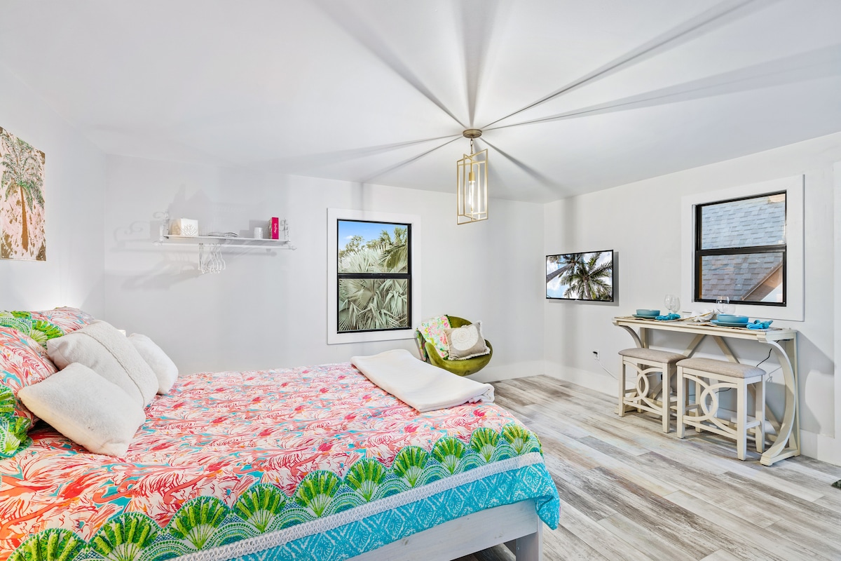 Üdvözlünk a Lake Worth Beach történelmi negyedében található „Royal Poinciana” programban! Gyönyörű, teljesen felújított 1920-as házunk 100 méterre van az Intracoastal Waterway-től, egy mérföldre a Lake Worth Beach-től, és csak néhány háztömbnyire a belvárostól. Van egy teljesen felszerelt konyhád, amely a készüléksorok tetején található, egy nagy privát udvar kültéri zuhanyzóval és tűzrakóhellyel, mosási lehetőség az egységben, Wi-Fi és Roku TV. Tartalmaz 2 strandcirkáló kerékpárokat, strandszékeket, törölközőket és esernyőt. Szeress bele lélegzetelállító oázisunkba!
