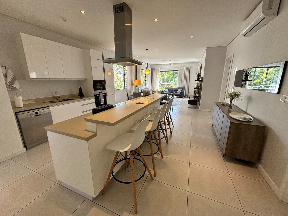 Szállj meg újonnan meghirdetett, tengerparti lakásunkban Pointe aux Pimentsben, Mauritius északnyugati részén. 3 hálószobát (3 kétszemélyes ágy), 3 fürdőszobát (2 en-suite) és egy nagy nyitott konyhát/nappalit kínál, amely egy óceánra néző privát teraszra nyílik. A lakás teljesen felszerelt (mosógép, mosogatógép, légkondicionálás stb.), és ingyenes parkolással rendelkezik. Egy privát és biztonságos komplexumban található, egy végtelenített medence is rendelkezésre áll a lakók számára (gyermekmedencével), és közvetlen hozzáféréssel rendelkezik a strandhoz.