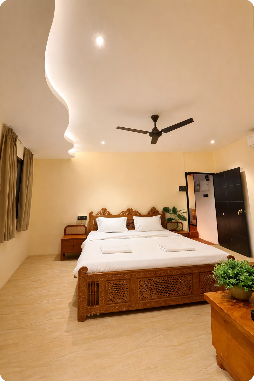 Our Signature Room is a design-forward space featuring a King bed, an open to sky bathroom, and a bathtub blending comfort with thoughtful aesthetics. The room is equipped with high-speed Wi-Fi, air conditioning, and a smart TV for a seamless stay. Located just 1.5 km from the beach and 900 meters from the local market, the property offers easy access while remaining a peaceful retreat. Our spaces are intentionally designed to foster community, creativity, and authentic travel experiences.