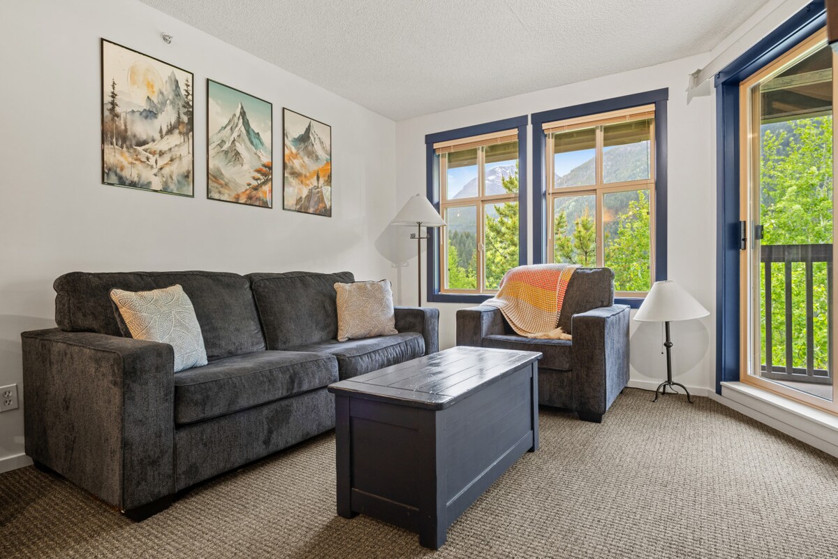 This 2-bedroom, 3-bed unit is one of the few located right beside the Toby Chairlift. Enjoy true ski-in/ski-out access to green runs, with a scenic ski bridge you get to ski on your way down. Guests have full access to 2 summer swimming pools and water slides, year-round heated pool and several hot tubs, sauna, and gym. Just steps away from tennis courts, mini golf, heli-skiing, restaurants, pubs, general store with groceries, essentials, wine, and beer. No need to drive anywhere!