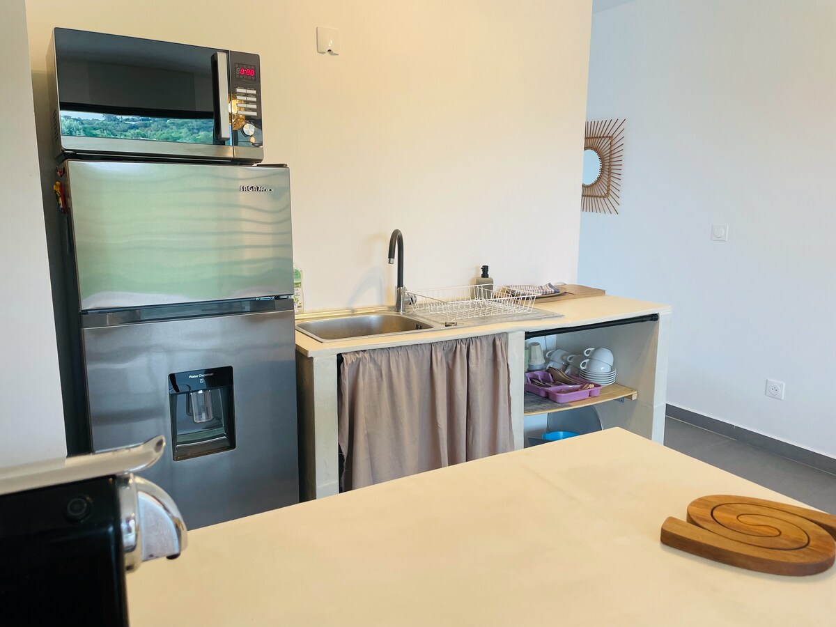 Transport gratuit entre l'aéroport et la villa Très belle chambre luxueuse -appartement hôtel avec dressing, wifi, climatisation et brasseur d'air salle de bain, cuisine équipée avec lave vaisselles, très grande terrasse privée offrant une vue unique et incroyable sur l'océan et la nature et une vallée dans laquelle vous aurez parfois la chance d'admirer une cascade . Entrée privée. Confort total, lit king size.