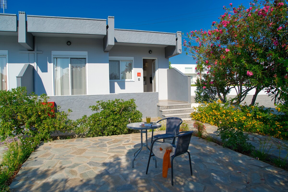 "Rodania Spring" is a 50 sqm house accommodating up to 4 guests in two bedrooms. It is part of a total of four ground-floor adjoining houses. Located at the outskirts of Faliraki, in a serene countryside area, 650 meters from the beach and just 1.5 kilometers from Faliraki's vibrant center. Perfect for couples, friends, and family getaways.