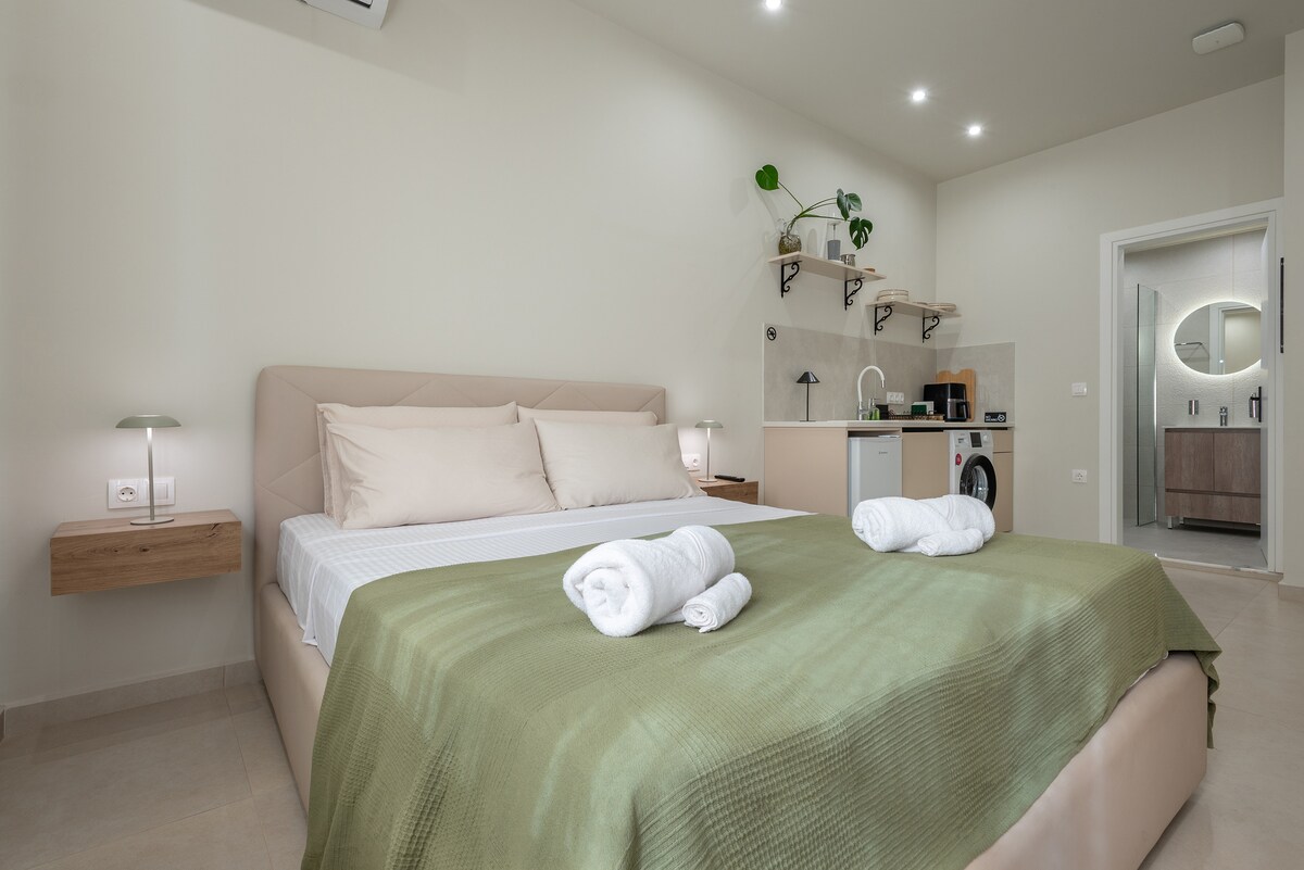 Stúdió egy felújított 19. századi kúriában, Myrina központjában. Egy csendes utcán a piac és a város legrégebbi negyede, a Római Gialos között, a kastély alatt. A kúriákkal, amelyek közül az egyik az Régészeti Múzeumnak ad otthont, a strandokkal, éttermekkel, bárokkal. Csak 30 méterre van a tengertől és 150-200 méterre Monopetro és Rihi Nera homokos strandjaitól. A kastély másik oldalán a kikötő a tavernákkal és a régi kávézókkal.