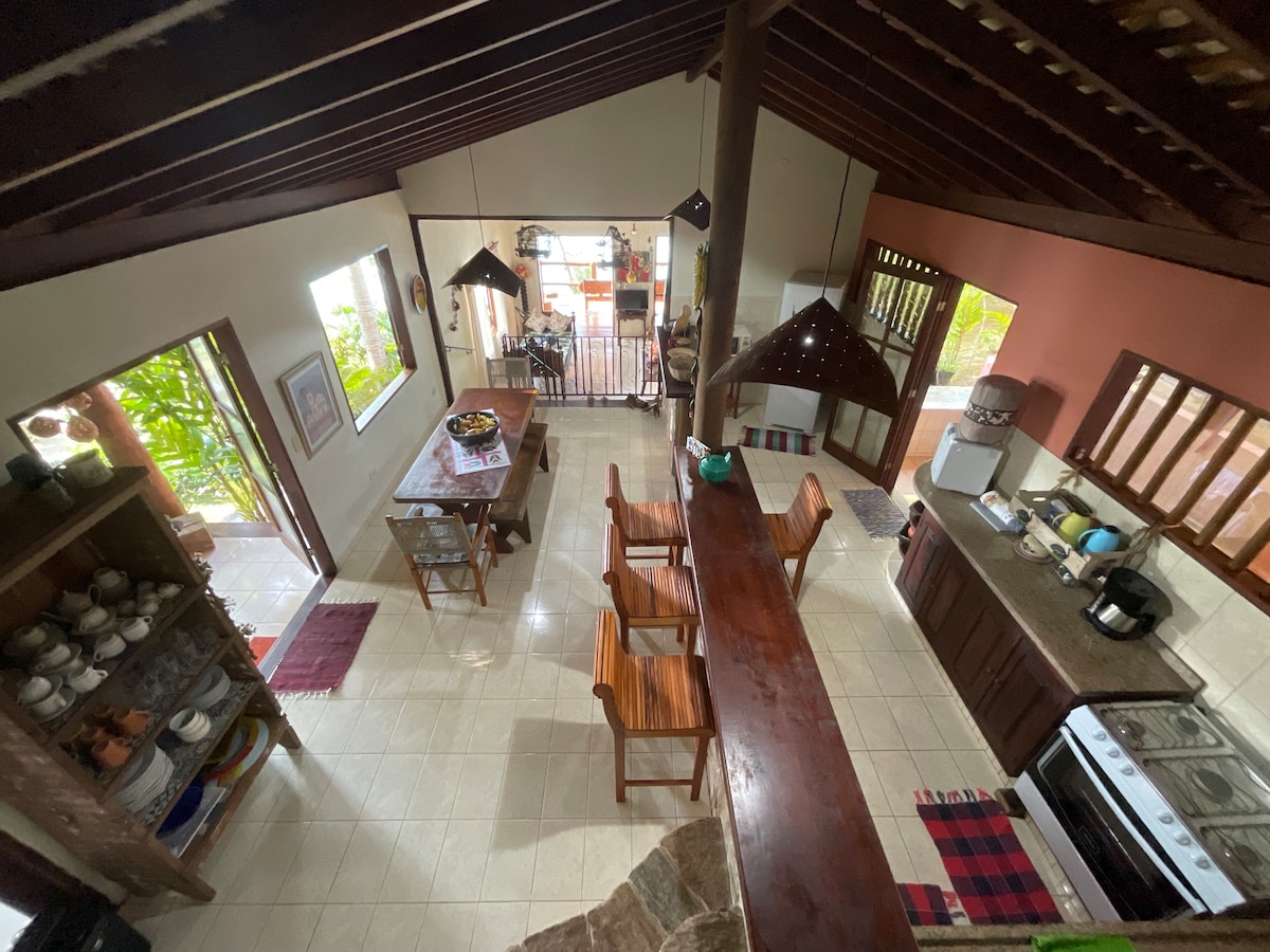 04 SUITES, 05 BANHEIROS Esta acomodação elegante é perfeita para viagens em grupo, familiares e amigos. Localizada em frente da praia, com uma vista privilegiada possui Wifi, piscina, uma área de lazer completa com churrasqueira e forno para Pizzas. Disponibiliza garagem dentro da propriedade uma cozinha completa toda equipada, geladeiras com freezer, e uma ampla sala de jantar e Tv. Os chuveiros possuem agua quente com sistema de aquecedor solar.