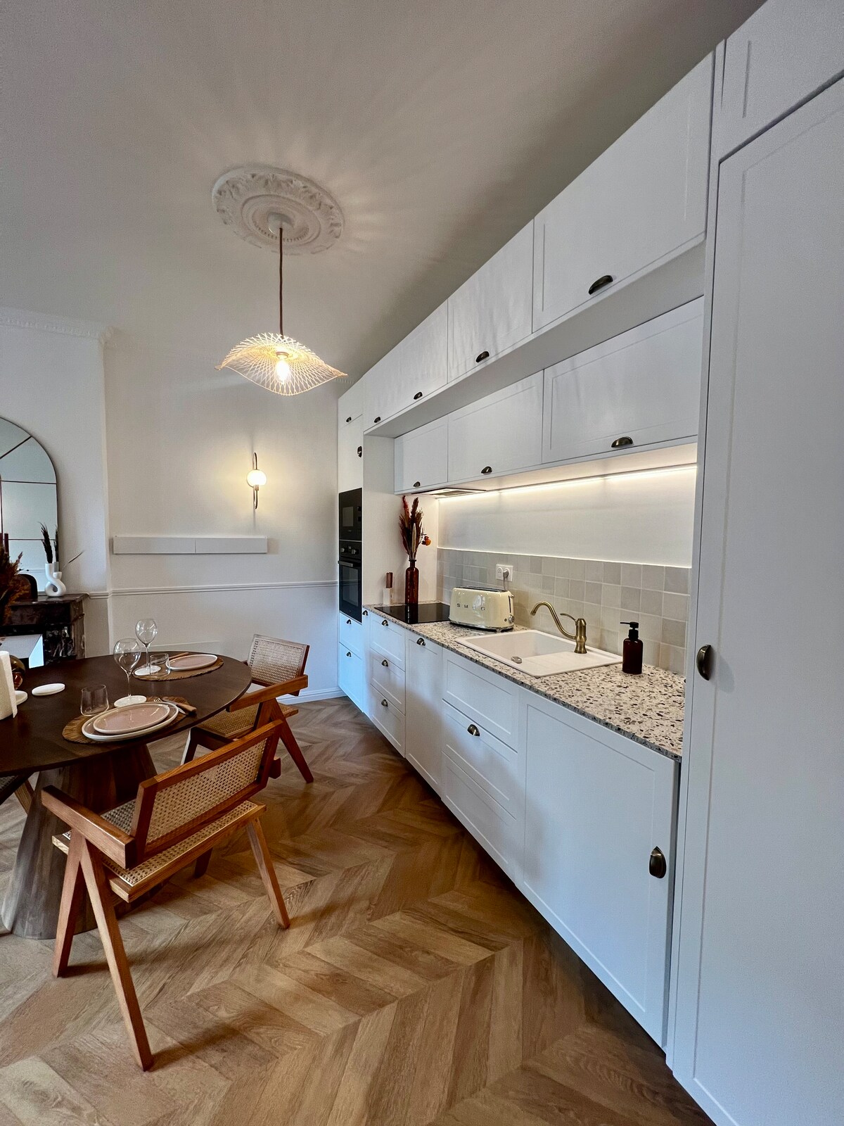 A KRAFFT egy 79 m2-es kényelmes lakás, amely Reims hiperközpontjában található, és akár 4 fő elszállásolására is alkalmas. Csak egy kis épület 2. emeletén található, amely csak 3 apartmanból áll. Teljesen felújított, 2 hálószobából áll, csúcsminőségű szállodai ágyneművel, egy 29 m2-es nappaliból – TV - WFI, felszerelt konyha, fürdőszoba a hálószobával, zuhanyzó, önálló vécé. Fel van szerelve megfordítható légkondicionálással.