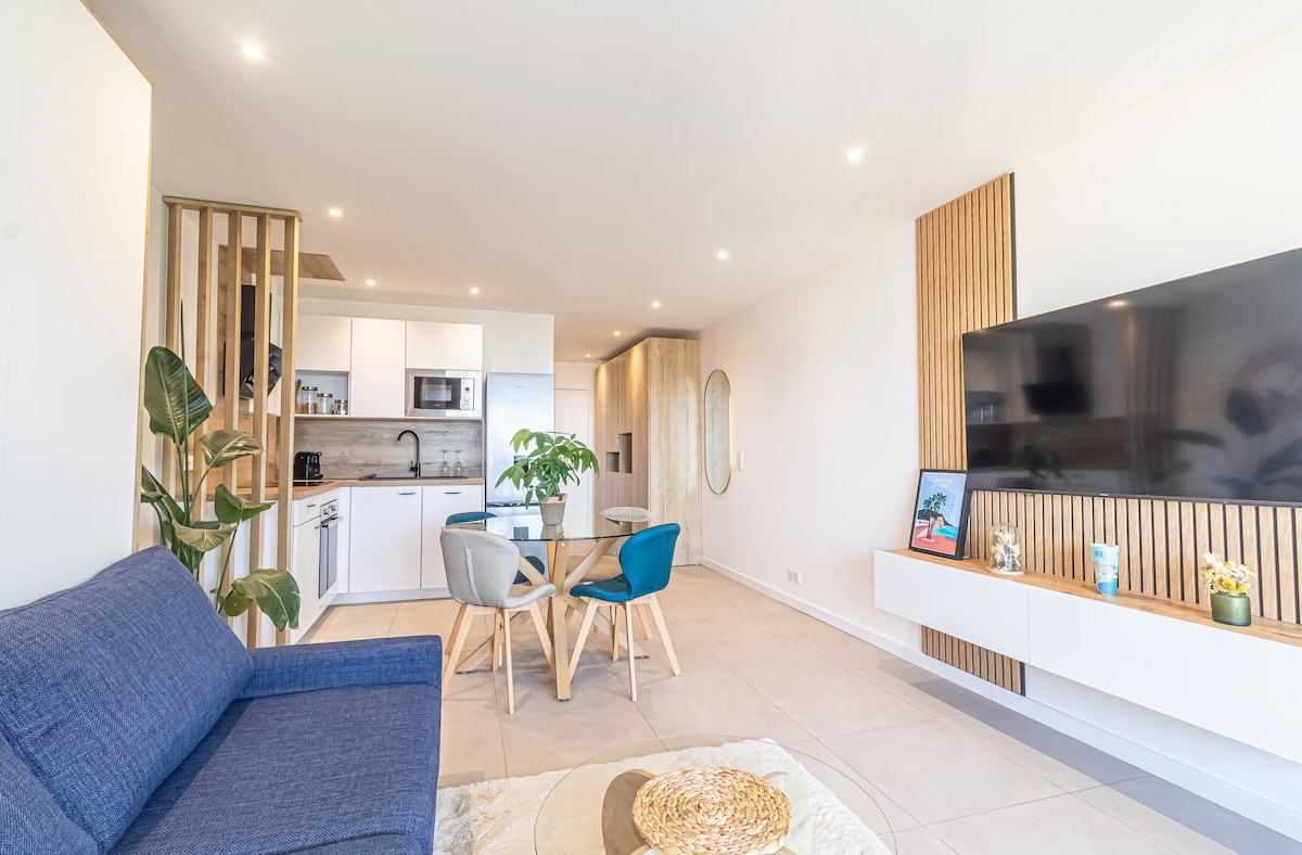 Egy 3 szobás lakás, amely dél- és délnyugatra néz, és minden szükséges kényelmet biztosít a kellemes 2 fő elszállásolásához. Saját parkolóval és napsütötte loggiával rendelkező kerttel rendelkezik, hogy élvezhesse a jó időjárást. A strand és a CAP3000 bevásárlóközpont 15 perces sétára, illetve 5 perces autóútra található. A repülőtér és a stadion autóval 6 és 10 perc alatt elérhető. Teljesen felszerelt, beleértve a száloptikás internetkapcsolatot és a közelben található összes kényelmi szolgáltatást.