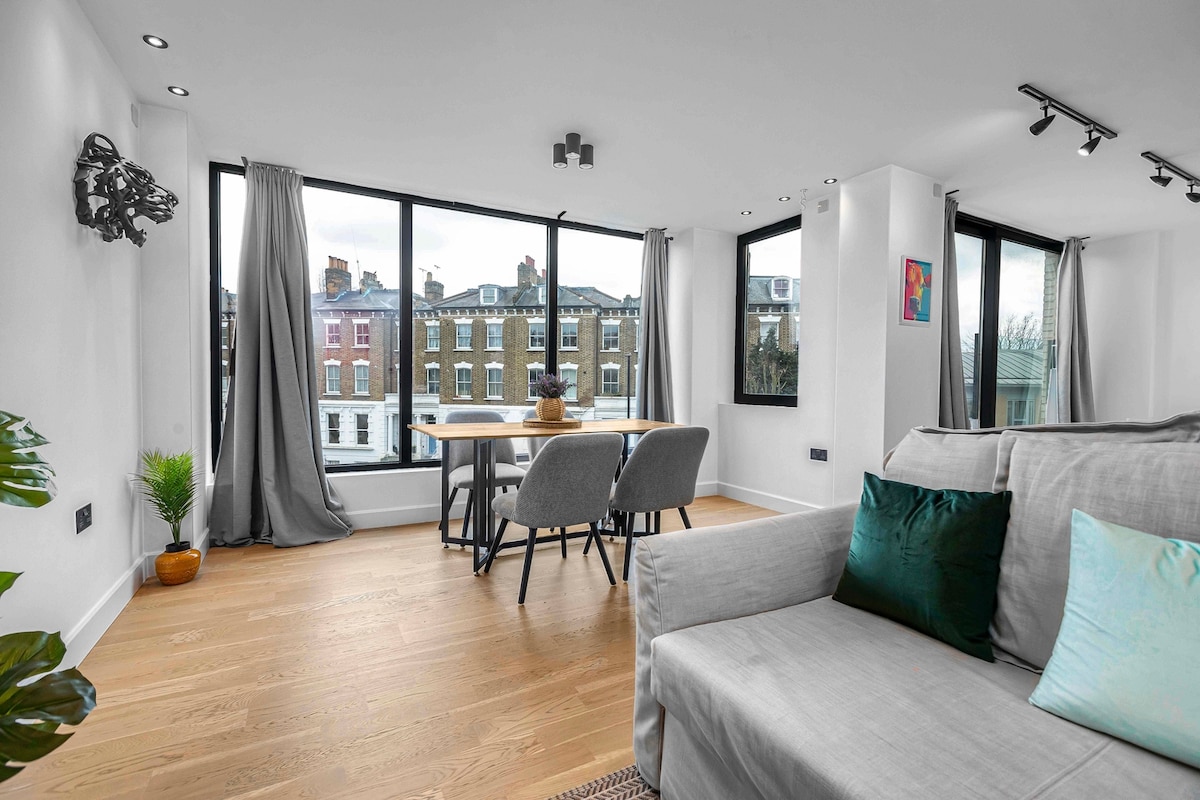 Welcome to a luxurious, quiet duplex in the heart of London. Enjoy lateral living with a huge chef's kitchen and a dining room that seats 10. Unwind with a 70-inch TV featuring Dolby Atmos or step out to a terrace with a BBQ and fire pit. Each of the 3 double bedrooms has its own bathroom for ultimate privacy. Minutes from Kings Cross, Granary Square, and local gems like great pubs and the Islington Tennis Centre. Your ideal London stay awaits!
