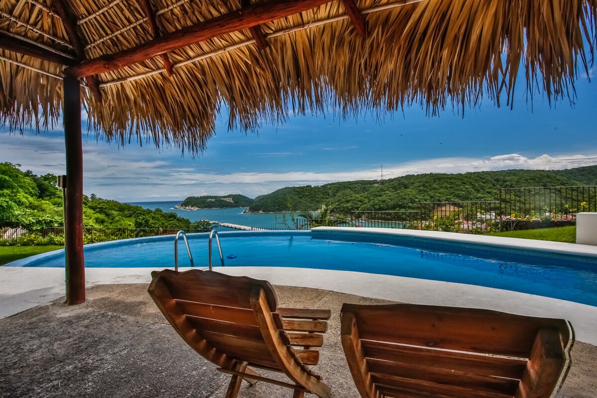Beach View home over looking the Tangolunda Bay. 4 bedrooms. Spacious outdoor living area next to the private pool. This older hill side home sits amongst incredible lush and tranquil paradisiac surroundings. Completely stocked kitchen, Fiber optic internet and Wifi, Private Secure Parking. Take a 5 min hike down to the small secluded private beach accessible on the property, or hang out by the water under the large shade area by our simple beach club (no beach club services are provided).