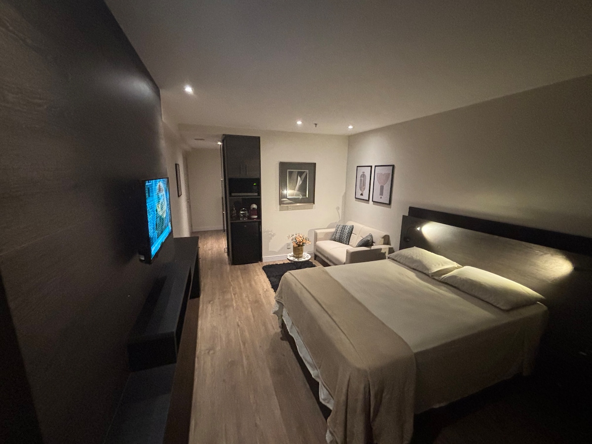 Flat completo no Edifício America Hotel & Residence, na melhor localização da cidade. Espaço com quarto, escritório, cozinha completa e banheiro. Inclui ar condicionado, TV por assinatura e Internet banda larga com wi-fi. Ideal para 2 ou 3 pessoas. O sofá cama de casal permite que durmam 4 pessoas confortavelmente. O condomínio tem estrutura completa com piscina, sauna, restaurante, academia, espaço kids e muito mais.