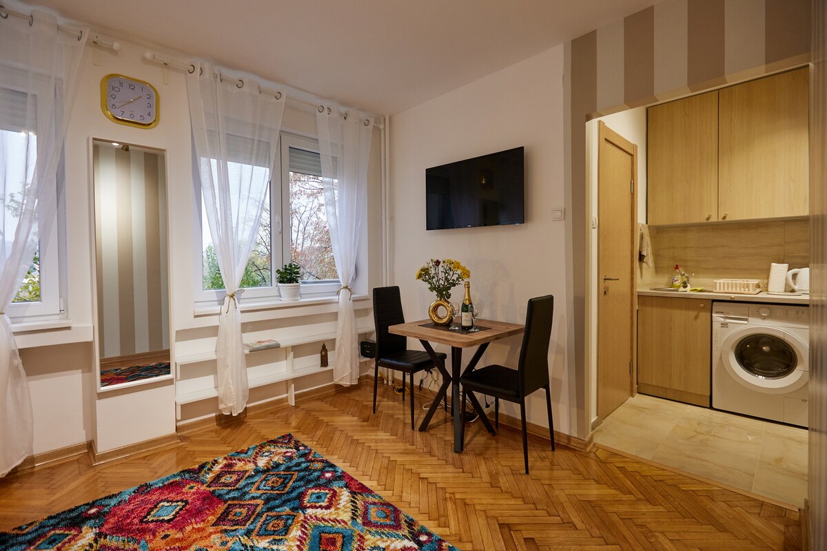 Ez a 80 négyzetméteres apartman két hálószoba osztva nagy konyha/étkező/nappali. Az apartman található, sétatávolságra a főbb belgrádi turisztikai helyszínek – Nemzetgyűlés, Múzeum és Színház, Knez Mihajlova utca, Kalemegdan erőd, Skadarlija (a bohém negyed). A vendégek különböző ételeket és italokat fogyaszthatnak a közeli éttermekben, kávézókban és kocsmákban. A legjobb értékelésű éttermek egy része ezen a területen található. Van egy éjjel-nappali élelmiszerbolt a sarkon.