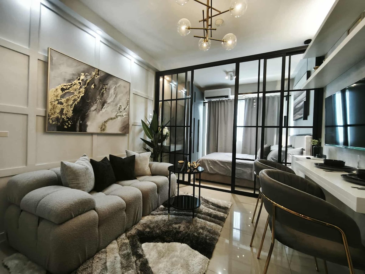 Üdvözlünk a CIRQ Studióban, az Eton Emerald Loftsban. Ez a vadonatúj, 40 négyzetméteres loftlakás az Ortigas Business District szívében található, és mindössze 4 perc sétára található a Robinsons Galleriától. A lakás fő témája és inspirációja a Japandi Modern szálloda - modern, századközepi bútorzattal és dekorációval díszítve. Semleges hangnemek sötét, fából készült textúrák kombinációjával, amelyek címán kék és aranyszerelvények találhatók, így a társasház minden szeglete készen áll az Insta-gramra. :)