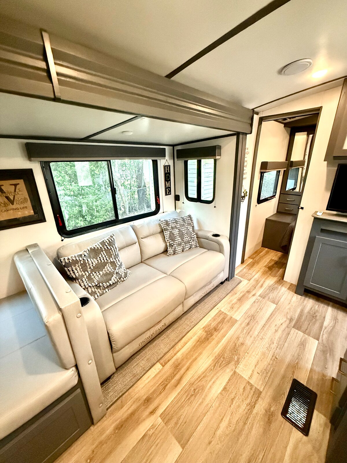 A peaceful rural retreat! Our RV offers a unique glamping experience, perfect for small families, couples and solo travelers. Unwind in comfort, surrounded by nature's beauty. Enjoy stargazing, birdwatching, or simply relaxing in the tranquil setting. Sleeping Arrangements: • 1 very comfortable Queen-size bed in the bedroom • 1 Black futon in the living room (suitable for 1 person)